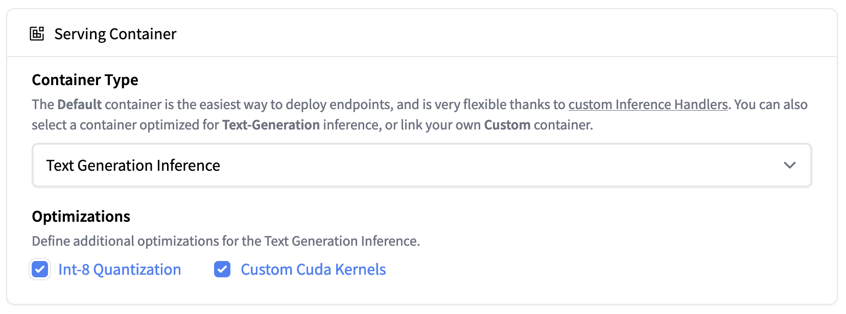 | Inference Endpoints now support Text Generation Inference. Deploy the Falcon 40B Instruct model easily on 1xA100 with Int-8 quantization |