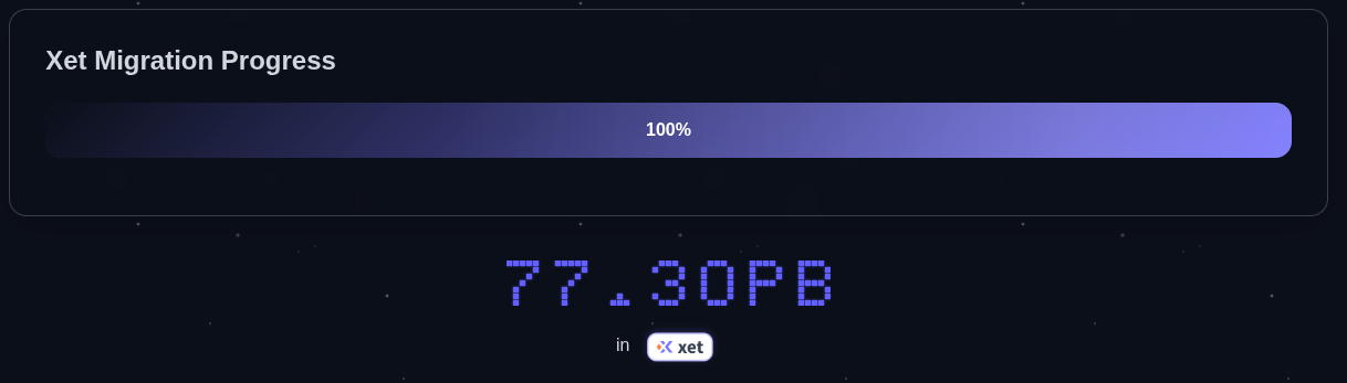 The migration was massive, starting with 20 petabytes across over 500,000 repositories. Yet it happened transparently, with full backward compatibility. One year later, all 77PB+ over 6,000,000 repositories have been migrated to the Xet backend, allowing for much faster (and smarter!) uploads and downloads. This happened with no user intervention, and no disruption to existing workflows 🔥