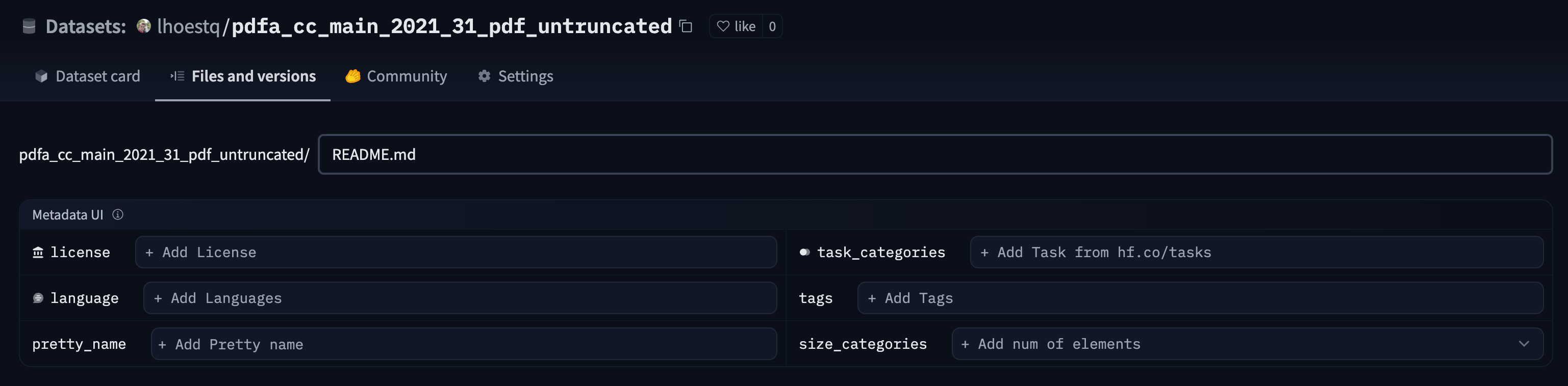 When creating a README.md file in a dataset repository on the Hub, use Metadata UI to fill the main metadata:
