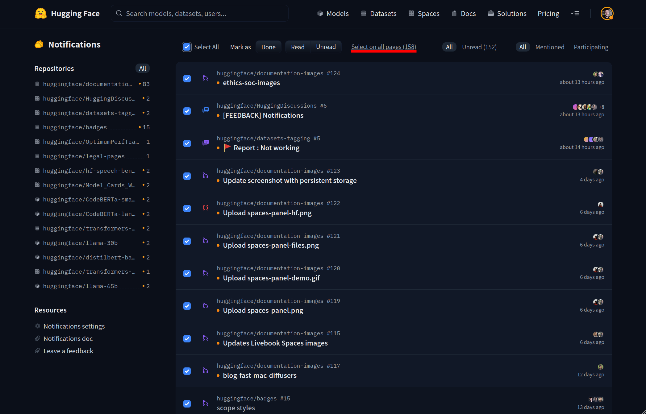 Notifications allow you to know when new activities (Pull Requests or discussions) happen on models, datasets, and Spaces belonging to users or organizations you are watching.