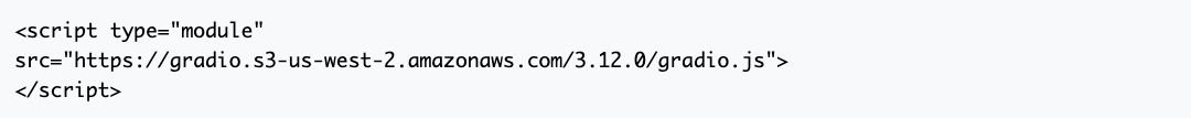 First, you need to import the Gradio JS library that corresponds to the Gradio version in the Space by adding the following script to your HTML.