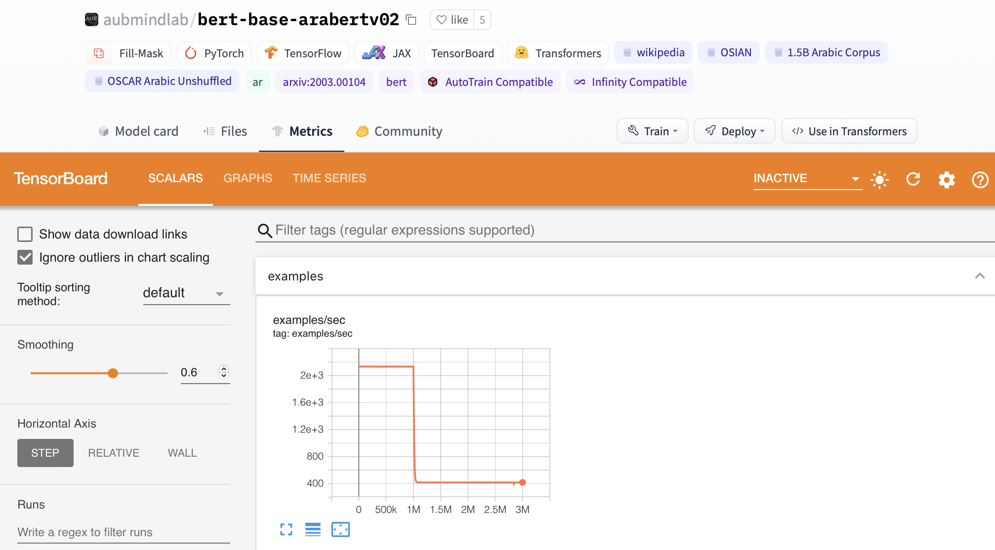 Over 52k repositories have TensorBoard traces on the Hub. You can find them by filtering at the left of the models page. As an example, if you go to the aubmindlab/bert-base-arabertv02 repository, there is a Metrics tab. If you select it, you’ll view a TensorBoard instance.