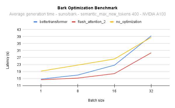model = BarkModel.from_pretrained("suno/bark-small", dtype=torch.float16, attn_implementation="flash_attention_2").to(device)Performance comparison