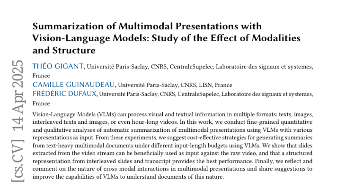 Summarization of Multimodal Presentations with Vision-Language Models: Study of the Effect of Modalities and Structure Paper • 2504.10049 • Published Apr 14, 2025 • 2