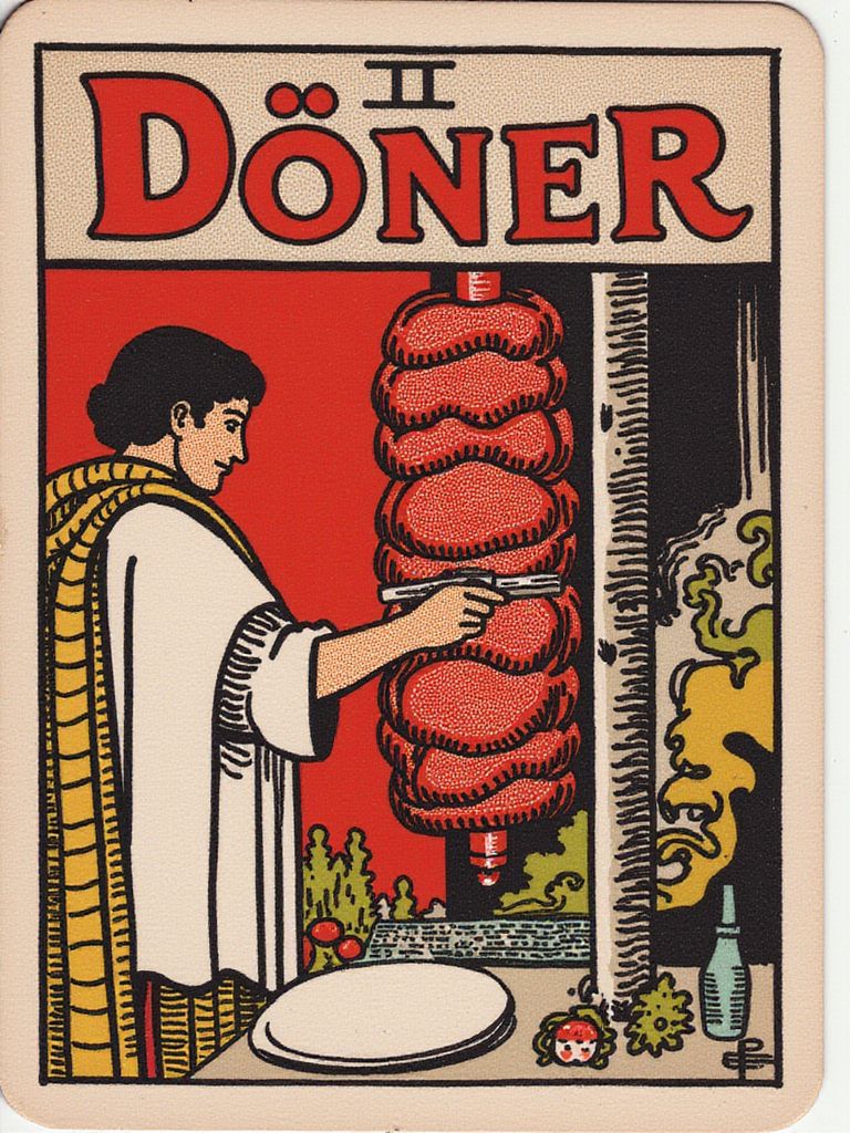 - a man cutting meat from a kebab vertical rotisserie, it reads "Döner" in the style of TOK a trtcrd, tarot style