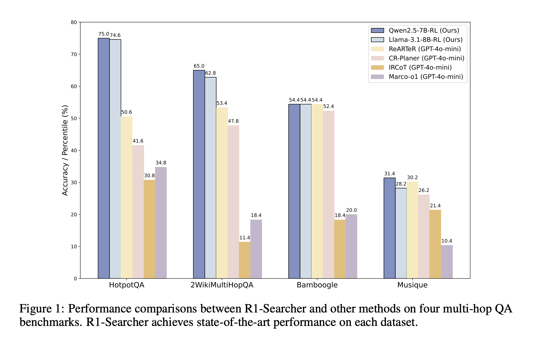 R1-Searcher is a reinforcement learning approach that enhances large language models' reasoning by autonomously accessing external knowledge, achieving better performance than existing methods.